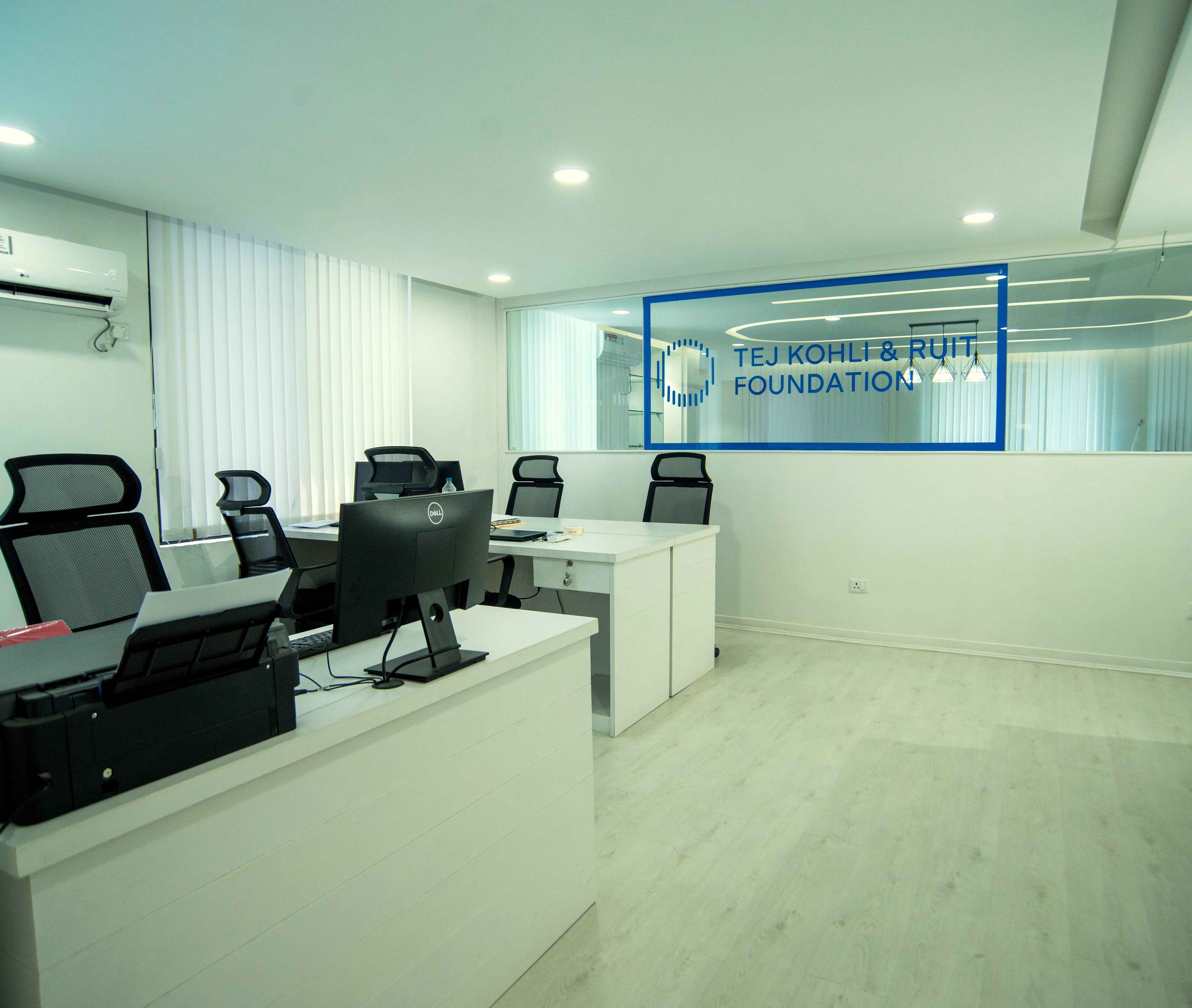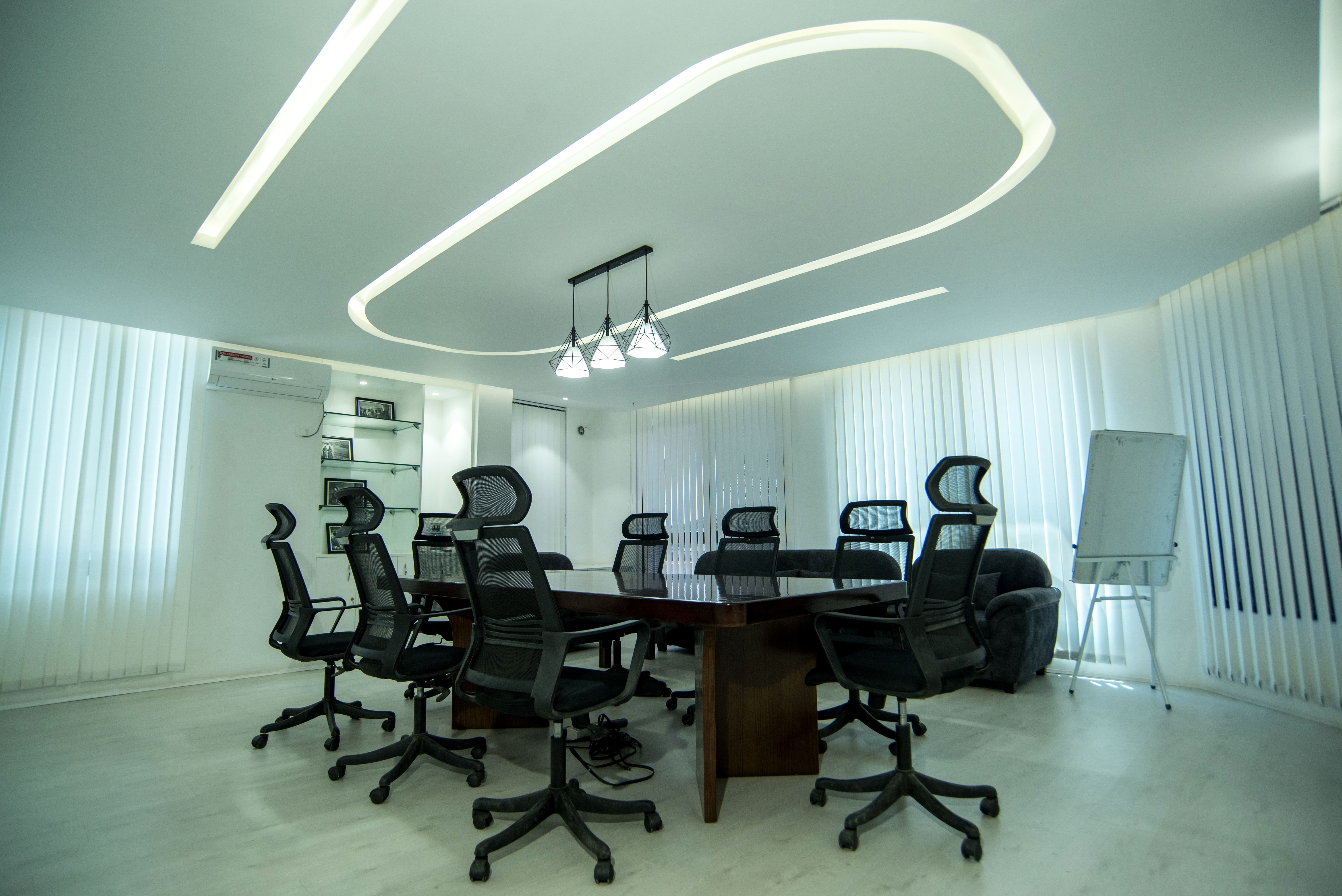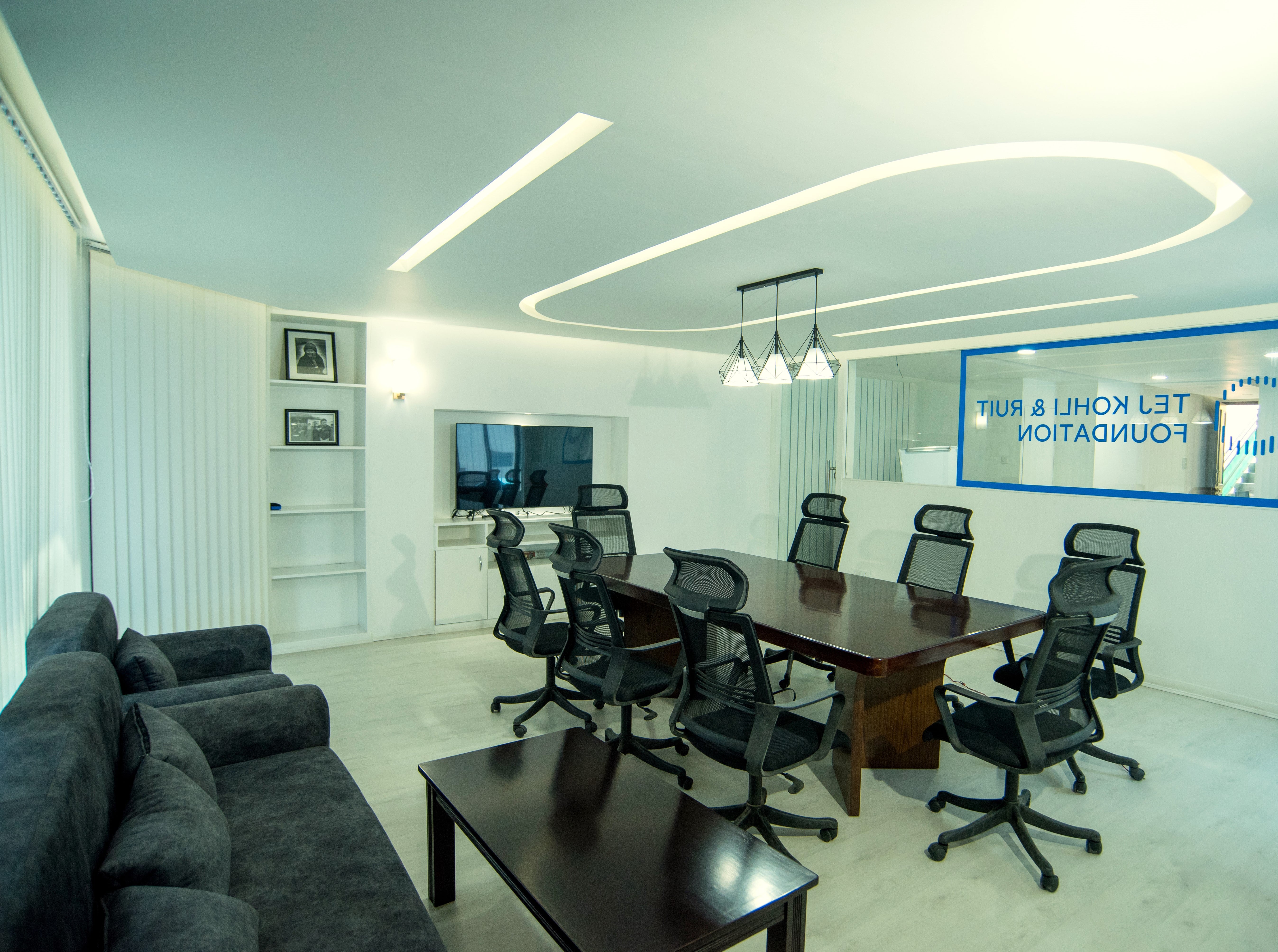 Office space designed for the Ruit Foundation where the interior works are done with a minimal approach in mind. With a small space to work on, the client required a board room for their international meetings and a few working desks for their employees. With enclosed LED light strips and all-white paint works, the working area looks appealing and spacious.